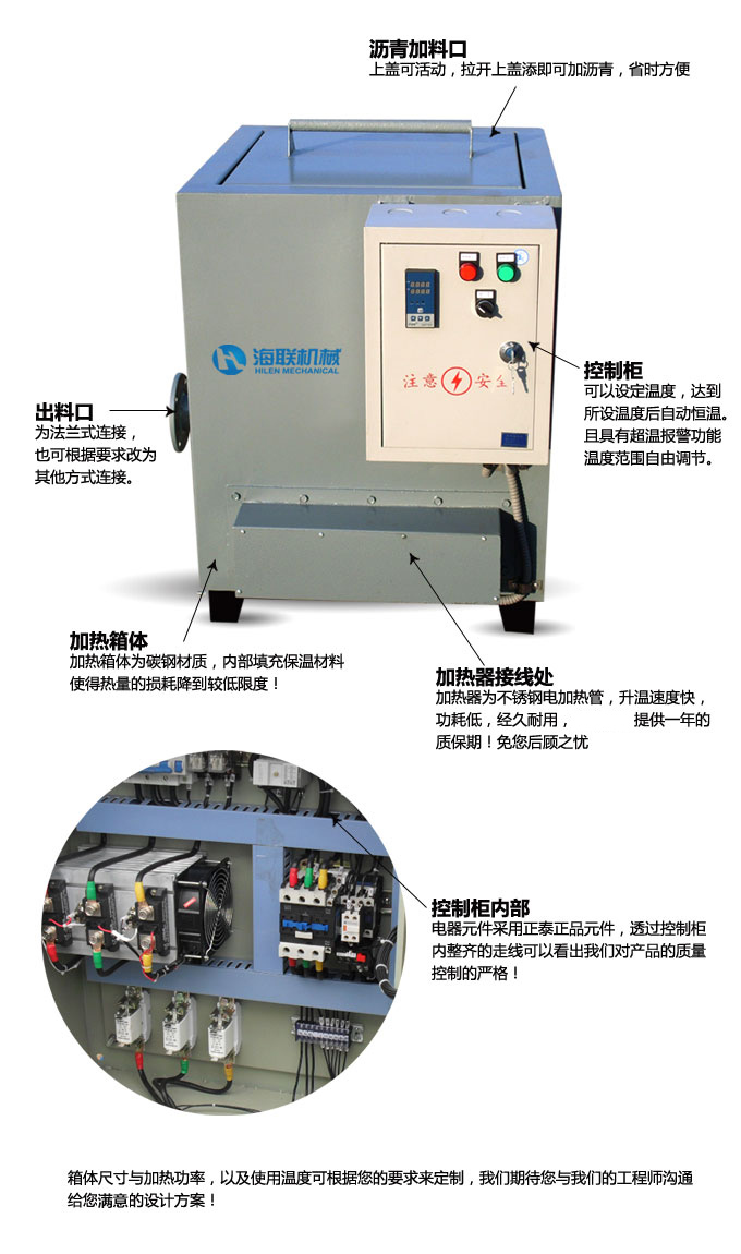 瀝青電加熱器具有加熱速度快、加熱均勻、環(huán)保等特點(diǎn)。具體加熱功率根據(jù)客戶需要定制。